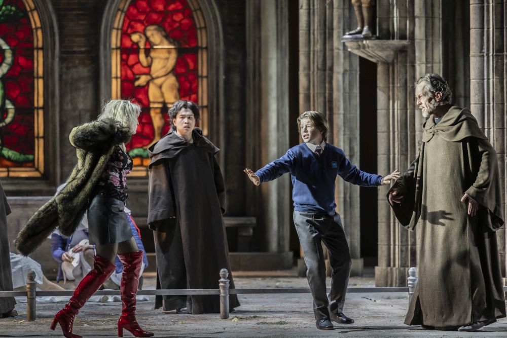 Und doch sind alle erlöst, und zwar, weil ihnen ein Kind eine Geschichte erzählt hat. So erklärt es Regisseur Floris Visser im Programmheft – und liefert damit gleich den Schlüssel zu einem Abend, der sich von Anfang an in die Perspektive eines kindlichen Blicks flüchtet. Dieses Kind gehört zu einer Schulklasse, die während des Vorspiels zum ersten Aufzug die „Abtei St. Parsifal“ besucht, eine gotische Kirchenruine, die im Programmheft nicht ohne unironische Gravität so benannt wird. Während des Vorspiels bevölkert sich dieser Raum außerdem mit einer erstaunlichen Ansammlung von Figuren: Pilger, Invaliden, eine Prostituierte, Punks.