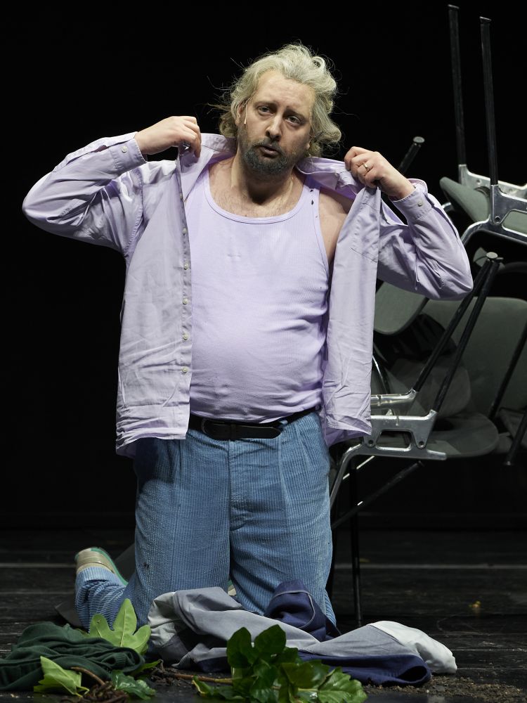 Dass Kain, Abel und Ada sich stetig – verborgen hinter Lektüre – im Raum befinden, auch wenn sie laut Protokoll abwesend sein sollten, benennt die Geister, die das Urpaar umtreibt. Das aber leider im Wortsinne. Etwas mehr Tristan-Metaphysik, in dem Fall schlicht Mut zur Lücke, wäre gut gewesen. Es war nun mal kein Grund ersichtlich, wieso Eva dauernd zum Wasserspender (gemeinsam mit der 5 vor 12 zeigenden Uhr, einem Abfalleimer, mehreren Stühlen und den beiden Zweigen, die den gefällten Baum ebenso wie das giftige Kraut darstellen sollten, den einzigen Requisiten) laufen musste. Dass mangels Alternative die Stühle zum Scheiterhaufen für das Opfer gestapelt werden mussten, ist sozusagen eine lässliche Sünde. Abstraktion ist hier vermutlich das Thema.