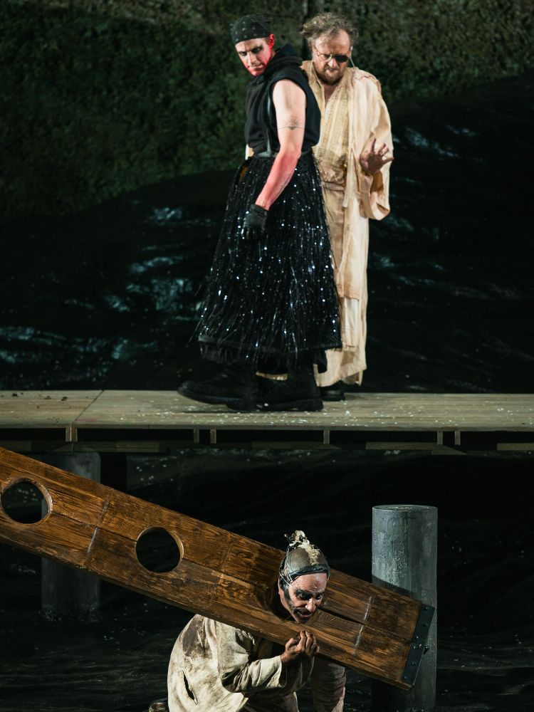 Dem hält Kirill Serebrennikov, der Bühne, Kostüm und Regie in Personalunion vereint, ein Theater der Anspielungen und der des Mythos entgegen. Zwei Lava-Hügel oder verschmutzte, glatte Gletscher bilden den Boden, Pflöcke sind in ihn gerammt, auf den immer wieder Bretter gelegt werden, damit die Götter nicht den Boden berühren müssen, der offenbar kontaminiert ist. Deshalb werden sie zwischendurch auch getragen von dunkel gekleideten Männer, die effektvoll auch den Riesenwurm darstellen, in den sich Alberich verwandelt. Das sind unter anderen die „Performer“ der „Compagnie Baninga“.