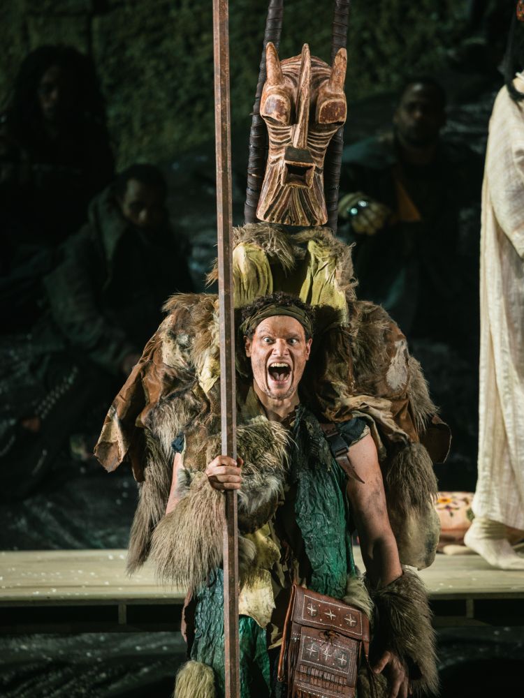 Auf acht Leinwänden nebeneinander über der Szene, die später ihre Stellung magisch verändern werden und auch schon mal gühende Lava oder den Regenbogen darstellen, über den die Götter ihre Burg betreten, sieht man in Schwarzweiß einen nackten Indigenen in einer arktischen oder postapokalyptischen Wüste dahinstolpern; aus dem Mund quillt ihm Erde oder gestocktes Blut. Es könnte Alberich sein. Doppelgänger gibt es auch auf der Bühne, deren Personal in afrikanischer Kleidung samt Kopfschmuck und Kultgegenständen aller Art auftritt. Die Riesen etwa tragen eine Art riesiger Krone. Auch die Rheintöchter sind archaisch gekleidet und tragen einen schönen Kopfputz, während Loges Kopf ein Piratenkopftuch bedeckt, die Arme rot geschminkt. Er hat auch eine „Rothaut“ – mit rot geschminktem Oberkörper – als Doppelgänger und ist fahrender Händler mit einem bunten Gefährt, auch einen ebensolchen Schirm besitzt er. Ein wenig hat er da was von einem Narren aus einem Shakepeare-Stück.