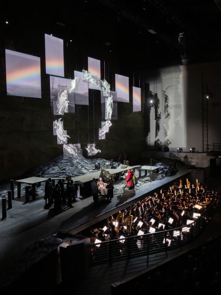 So optisch reizvoll das das Alles ist, so beliebig ist es manchmal und den Zuschauer verwirrend, der nicht auf den ersten Blick entdecken kann, wer zu wem gehört und warum, wer gerade singt oder „nur“ performt. Immerhin verzeichnet das Programmbuch 15 Performerinnen und Performer sowie einen Statisten, die immerhin die Breitwandbühne der Felsenreitschule gut füllen können und so auch nie Langeweile aufkommt. In ihren besten Momenten gehen die Düsternis der Inszenierung und dass sie teilweise überbordend ist, eine Einheit ein.