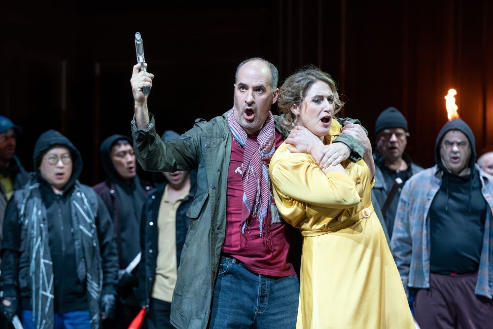 Auf der Bühne aber erweist sich die Lesart von Regisseur Bernd Mottl dann aber enttäuschend beliebig und nicht immer stringent. Wirr geht es beispielsweise zu mit der Kostümierung (Alfred Mayerhofer) des Chors: Mal haben die streikenden Arbeiter Werkskleidung in den Farben der Ukraine, das Überfallkommando dagegen sieht aus wie der schwarze Block bei Demonstrationen, vor der Schlussszene zieht das Volk kugelsichere Westen und Tarnkleidung über die Abendgarderobe. Wer ist rechts, wer ist links, wer kämpft für welche Rechte?