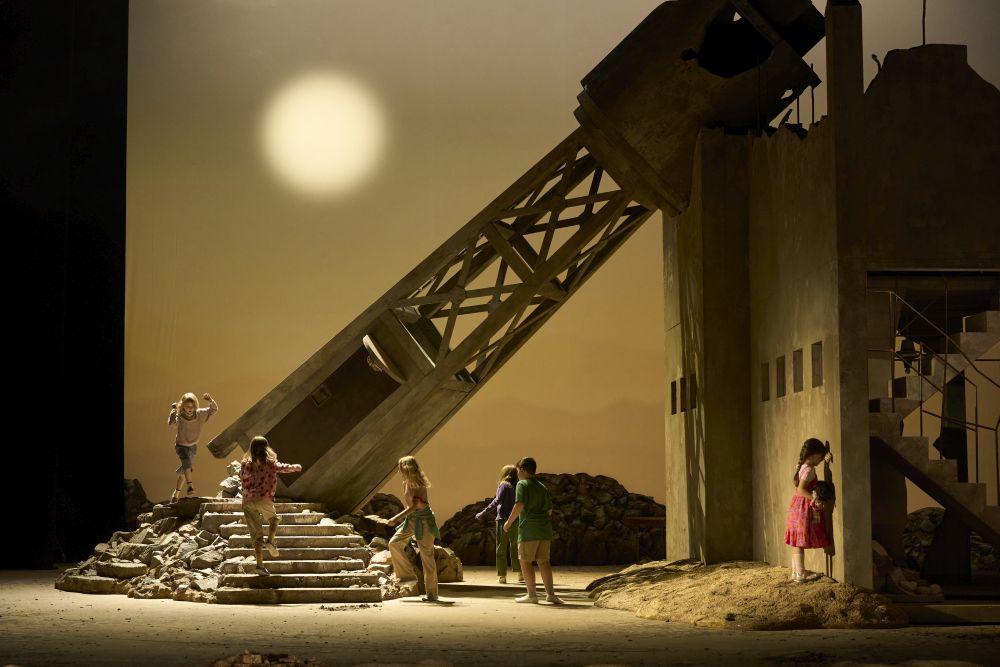 Unbedarft fröhlich spielen die Kinder im Schutt um die Skelette eines Wasserturms und eines Gebäudes, das ein Kasernenhäuschen gewesen sein mag, herum. Überall hüpfen sie hin. Ptah und Isis halten wohl schützend ihre Hände über sie. Denn kaum hat das Spiel begonnen, eilen besorgte Eltern geduckt herbei, ihre Leben riskierend, um die Kleinen zu bergen. Ein Mädchen verliert dabei seine Puppe. Die Mutter kehrt um, sie zu holen, eine Explosion zerreißt die Klänge der Ouvertüre, tot liegt die Mutter, fast teilnahmslos reagiert die Kleine, Krieg und Sterben sind das ihr von Kleinauf eingeschriebene Schicksal.