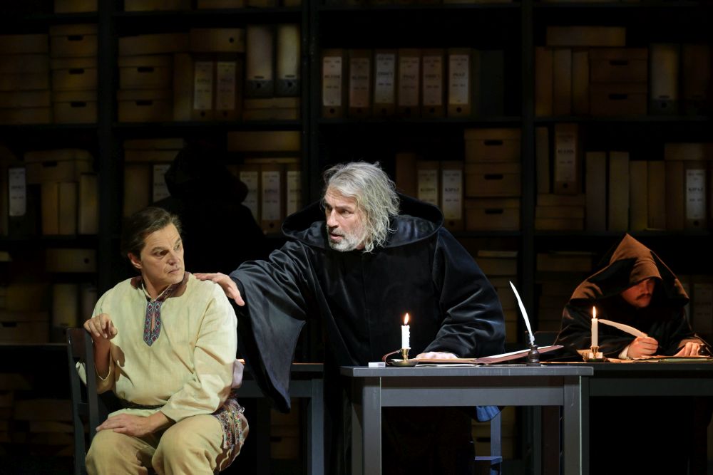 So erscheint eine riesige Bibliothek, vor der Mönche eifrig schreiben, als Hintergrund des ersten Bildes. Im Kloster Tschudow initiiert der Mönch Pimen versehentlich die nächste Machtübernahme im instabilen Zarenreich, als er dem jungen Grigorij das letzte Kapitel seiner Chronik Russlands überträgt. Andreas Bauer Kanabas ist mit seinem wohlgeführten, von der Rolle gänzlich durchdrungenen Bass eine Offenbarung. Dmitry Golovnin als Grischka Otrepjew, dessen strahlender Tenor zwischen echter Innerlichkeit und wahrem Wahnsinn schillert, zunächst einmal auf der Flucht. Er könne im Alter des von Boris Godunow vermutlich gemordeten Zarewitsch Dmitrij sein, hatte Pimen durchblicken lassen. Und prompt geriert Grischka sich zum Wiederauferstandenen. Mit aller Raffinesse des Emporkömmlings schlägt er sich bis an die Grenze Litauens durch. Da muss der inzwischen steckbrieflich Gesuchte im Wirtshaus noch mit der Dreistigkeit Glück durchs Fenster des Abtritts entweichen. Ein gelungener „Gag“ der Regie, der das düstere Geschehen ein wenig aufheitert. Kurz darauf sind ihm Volk und Militärs jedoch bereits verfallen.