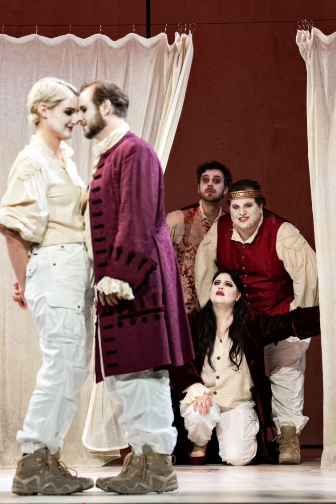Überhaupt ist die Besetzung hervorragend, es gibt keinen schwachen Punkt. Herausheben möchte man Dora Pavlíková (Timea, Sopran), die zweifellos die anspruchsvollste Partie hat und rundum begeistert; auch Stefan Sbonnik (Alcibiades, Tenor) wird seiner großen Rolle in jeder Hinsicht gerecht und setzt viele Glanzlichter, ebenso wie Amber Fasquelle (Aspasia, Mezzosopran). Aleksey Kursanov (Pericles, Tenor) überzeugt sowohl gesanglich wie auch darstellerisch. Der Countertenor Fritz Spengler (Agis), der figürlich ein bisschen an Luciano Pavarotti erinnert, erweitert das Spektrum um eine weitere Klangfarbe. Auch den Sängern der etwas kleineren Partien, Ipča Ramanović (Telamides, Bariton) und Jakob Kleinschrot (Lisander, Tenor) bietet der Komponist Gelegenheit, sich in ihren Arien auszuzeichnen.
