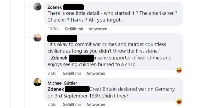 In any case, it is hardly surprising that Güttler came into the focus of Ukrainian activists, given his passionately contentious activity on social media, into which he must have invested enormous time and energy. Apart from regular exchanges with activists, he also stood out in seemingly insignificant channels with peculiar comments. In April 2024, for example, he participated – remarkable enough for a public figure – in a low-level discussion about the bombing of Dresden in World War II, which was undoubtedly a war crime, and responded to what was likely a rhetorical question from a user about who started the war with: “Great Britain declared war on Germany on 3rd September 1939. Didn’t they?” – which can be interpreted as blaming Great Britain for the outbreak of World War II, as if the German attack on Poland had not preceded the declaration of war.