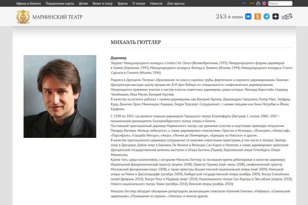 On the day of his Moscow performance, Güttler publicly shared news of the impending release of political prisoners in Belarus, calling it “Good news!” Absurdly, he claimed to be at La Scala in Milan (see screenshot). Furthermore, Güttler’s biography can be found in the Russian-language section of the Mariinsky Theatre’s website in St. Petersburg – after the English-language version, which we were able to prove in court, disappeared during the proceedings. Has Güttler’s peculiar behavior already become known among Western directors? Anyone searching for his name today in the Operabase database finds “No upcoming performances.”