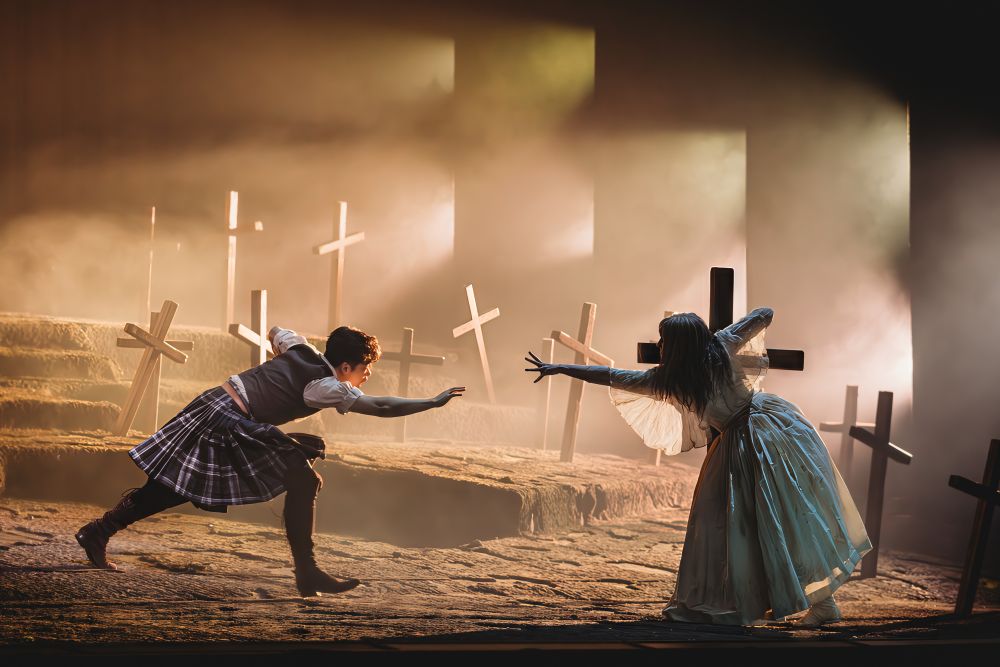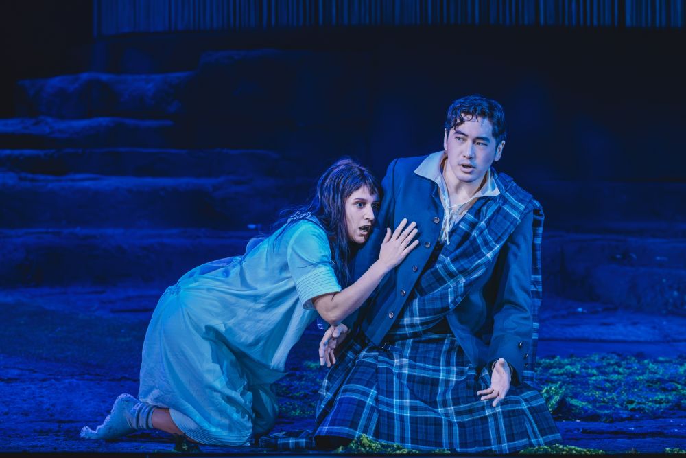 Quatrinis dirigentische Haltung und der von Olga Yanum bestens vorbereitete Chor bestätigen die gesamte Haltung und zwei beim Publikum bestens ankommende Tendenzen. Neben der für Verdis mittlere Schaffensperiode bis 1860 ebenso zuträglichen Frontalpower folgt auch Louisa Proske einem Trend. Junge Regisseurinnen und vor kurzem Elena Maria Artisi am Theater Gera und jetzt Proske setzen für das Lucia-Psychogramm wie die alten Regie-Oligarchen geradlinige Geschlechtszuweisungen: Männer quälen, aber die Frau im Zentrum leidet, träumt, mordet. In dieser Polarisierung machen altbewährte Striche aus der Zeit vor Bemühung um die musikalische Originalgestalt neuen Sinn: Der Zwischenteil der Wahnsinnsarie mit Lucias Schuld- und Reuebekenntnis am von ihr gemeuchelten Bräutigam Lord Arturo Bucklaw wurde gestrichen. Francesco Domenico Doto singt die Rettungsfinanzspritze Arturo für Lucias Bruder Enrico beeindruckend stilaffin – im weißen Anzug unter weißem Yankee-Hut. Im Kilt darf sich der Tenor Kang Wang als Edgardo di Ravenswood schon beim ersten Auftritt gegen seine heimliche, mit Zuckerbrot und Peitsche gemaßregelte Geliebte Lucia positionieren. Wang nimmt den von Donizettis Zeitgenossen als Melancholiker Byron‘scher Prägung verstandenen Edgardo di Ravenswood für eine eindrucksvolle Etüde zu den heldischen Verdi-Partien. Die Piano-Reprise der Selbstmord-Strophe kommt dann mit schmelzendem Piano.