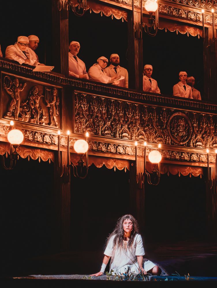 Proske erweiterte auf der ziemlich großen Festspielhaus-Bühne die Studioaufführung ihres Ensembles Heartbeat Opera 2016. Darko Petrovic setzte deutliche Rauminseln für Lucias Double, das von ihr besungene Mord- und Liebesopfer aus grauer Vorzeit („Ravenswood Girl“: Sonja Golubkowa) sowie die horrible Psychiatrie-Zelle mit Fesseln und eisern zugreifender Pflege-Soldateska. Der doch recht US-amerikanisch ausstaffierte Deko-Rahmen vor den Rängen eines Opernhauses wirkt durch abwechslungsreiche Netflix-Ästhetik. Im realismusfernen Bühnenbild zieht Kaye Voyce mit prägnanten Kostümen alle realistischen Register. Suchtrupps (Fight Coordinator: Ran Arthur Braun) pirschen durchs Bühnentürkis (Licht: Jiyoun Chang). Frauen tragen zur Hochzeit Galaroben in Schmetterlingfarben und Flügelschnitten wie zur Oscar-Verleihung.