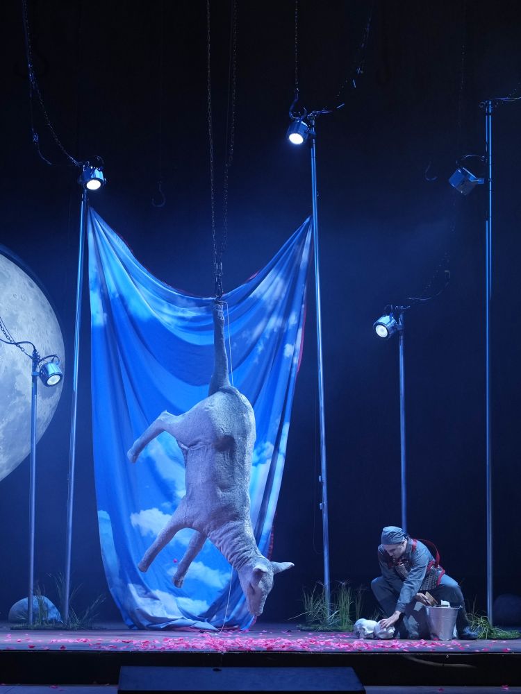 Die Minister Ping, Pang und Pong agieren bei Hadžiahmetović als Henker. Sie sind mit Alexander York, Jonathan Hartzendorf und Victor Campos Leal mehr als solide besetzt und stecken ebenso wie Christian Drescher als Kaiser Altoum in Kostümen, die der chinesischen Tradition abgeschaut sind. Für ein starkes Bild sorgt das Regieteam bereits im ersten Akt, wenn ein riesiges rotes Kleid vom Schnürboden herabgelassen wird, das mit der Prinzessin Turandot gleichsam den Elefanten im Raum nicht nur symbolisiert, sondern auch charakterisiert – und der Handlung vorgreift: Unter dem Kleid wird eine Hirschkuh sichtbar, für die Schlachtung bereit. Doch statt Gedärmen weiden die Henker-Minister Totenköpfe aus ihr heraus. Mit der Hirschkuh spielt das Regieteam wohl auf die Geschichte von Herakles an, der die Kerynitische Hirschkuh der Göttin Artemis jagen musste. Als er diese eigentlich unmögliche Aufgebe erfüllt hatte, ließ er sie laufen.