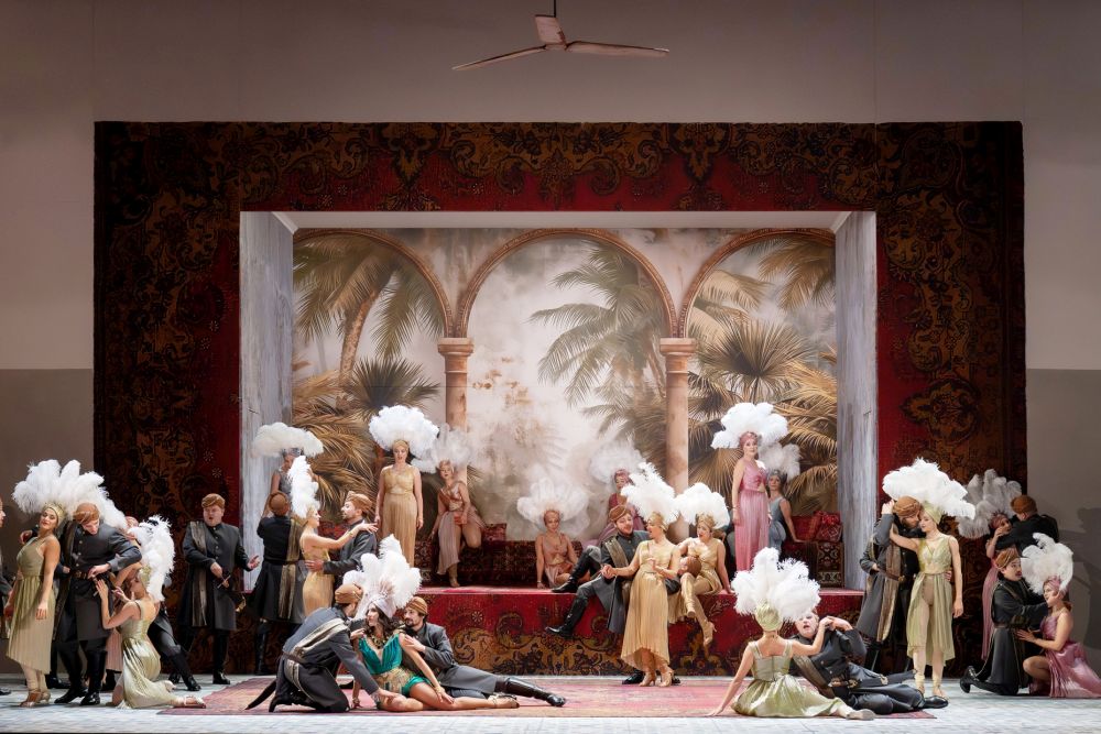 Loys opulente Inszenierung wird dem vielfältigen Charakter des Werks szenisch auf mehreren Ebenen gerecht: Befriedigt wird zum einen die Schaulust insbesondere in Herbert Murauers opulentem Bühnenbild im 1. Akt, im orientalischen Sultanspalast, wenn auf den Haremsdamen die Steinchen im satten Bühnenlicht (Fabrice Kebour) glitzern und die Federboas wacheln. Auch das restliche Hofpersonal steckt in edlen Mustern und Stoffen von Barbara Drosihn. Gemeinsam mit den Choreografien von Javier Pérez liefert Loy damit Ausstattungstheater der edelsten Güte. Doch der Ventilator an der Decke des Palastzimmers lässt bereits ahnen, dass Loy im Laufe des Abends nicht vorhat, das Stück aus dem 19. Jahrhunderts reaktionär auf eine heutige Bühne zu hieven. Wenn im 2. Akt auf Isfahans Basar dem alten, aber immer noch geilen Großwesir Abedul eine junge Sklavin für ein Schäferstündchen angeboten wird, steckt das Volk in heutigen Schnitten. Die Message ist klar: Die strukturelle Unterdrückung insbesondere von Frauen und insbesondere in orientalischen Kulturen ist ein scheinbar endloses, noch heute gültiges Thema.