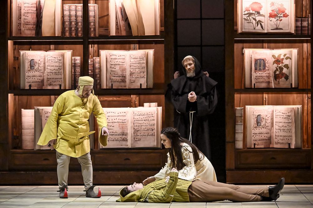 Wenn musikalisch bereits sämtliche Maßstäbe gesetzt zu sein scheinen, entsteigt auch Kateřina Kněžíková als Hedvika der Gruft und macht sich mit ihrem hellen, gleichermaßen schlanken wie kräftigen Sopran und mit einer phänomenalen Höhe zur Protagonistin des Abends. Glücklicherweise kann sie den Schlossherrn Vok rechtzeitig von ihrer Liebe zu ihm überzeugen. Und glücklicherweise entreißt der Klosterbruder Beneš dem Teufel die ihn darstellende Puppe, nachdem er sich mittels Beichte beim Burgvogt Michálek (komödiantisch: Vít Nosek) vom Bösen losgesagt und sein Leben endlich in die eigenen Hände genommen hat.