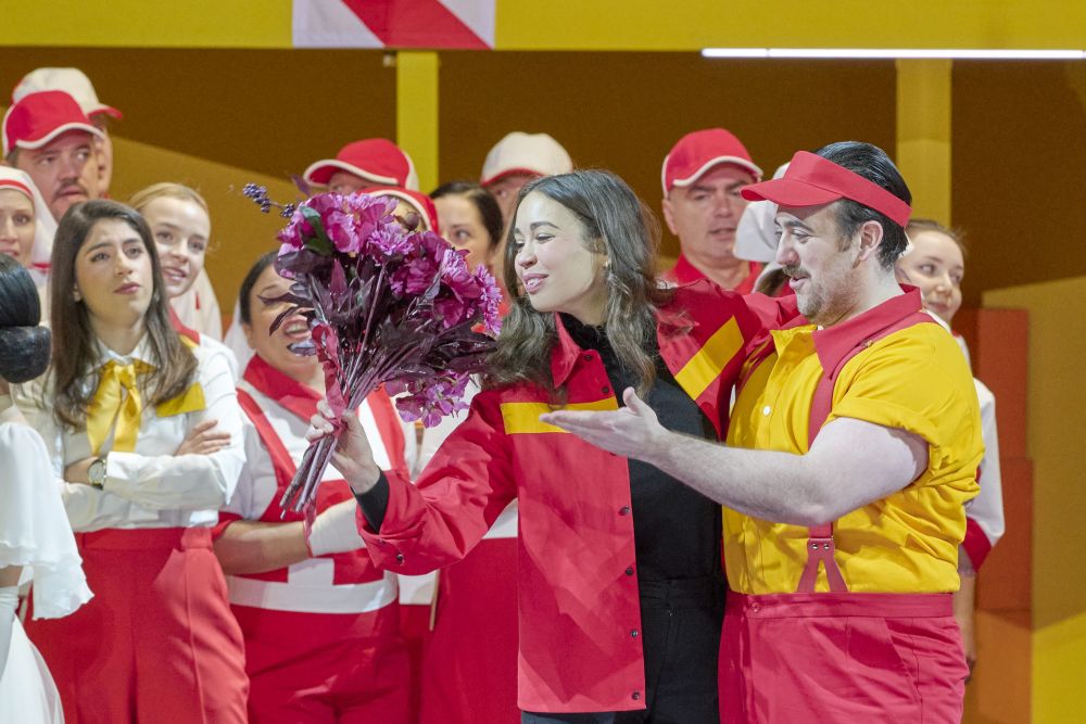 Vielleicht war es für den Russen einfach das falsche Stück. Dabei beginnt Philipp Grigorian seine Sicht auf Verdis Schiller-Adoption «Luisa Miller» durchaus vielversprechend, obwohl er in die Ouvertüre hineininszeniert hat: Der großartige George Petean sitzt an einer Wiener Öffi-Station und denkt als alter Mann an sein Leben zurück. Seine Tochter Luisa feiert in einer knallgelben Lagerhalle Geburtstag, die Belegschaft lässt sie groß feiern, der besorgte Papa warnt sie noch vor dem Hallodri, der ihr den Kopf verdreht hat. Die Torte mit den brennenden Kerzen kommt mit dem Gabelstapler, alle sind happy. Aber die Story kippt bei Grigorian – der sich dem fantastischen Realismus des russischen Theaterregisseurs Jewgeni Wachtangow verpflichtet fühlt und auch für knallig-übertriebene Bühnenbilder sorgt – nie wirklich. Die Mätzchen hören nicht auf, Grigorian vertraut der Kraft des Originals nicht. Natürlich schmunzelt das Publikum, wenn Luisa den von ihrem Herzblatt geschenkten Riesenteddy enttäuscht in die Bühnengasse schmeißt und der daraufhin zu ihr zurückgetrippelt kommt. Oder wenn die verwitwete Herzogin Federica (makellos: Daria Sushkova) in einer unendlich langen Stretch-Limousine vorfährt. Die Tragödie aber, bei der Verdi auch musikalisch ziemlich nahe an Schillers „Kabale und Liebe“ blieb, erfährt dabei eine das Thema verfehlende Verniedlichung, in der die Rückschau von Luisas Vater zudem zur Farce gerät.