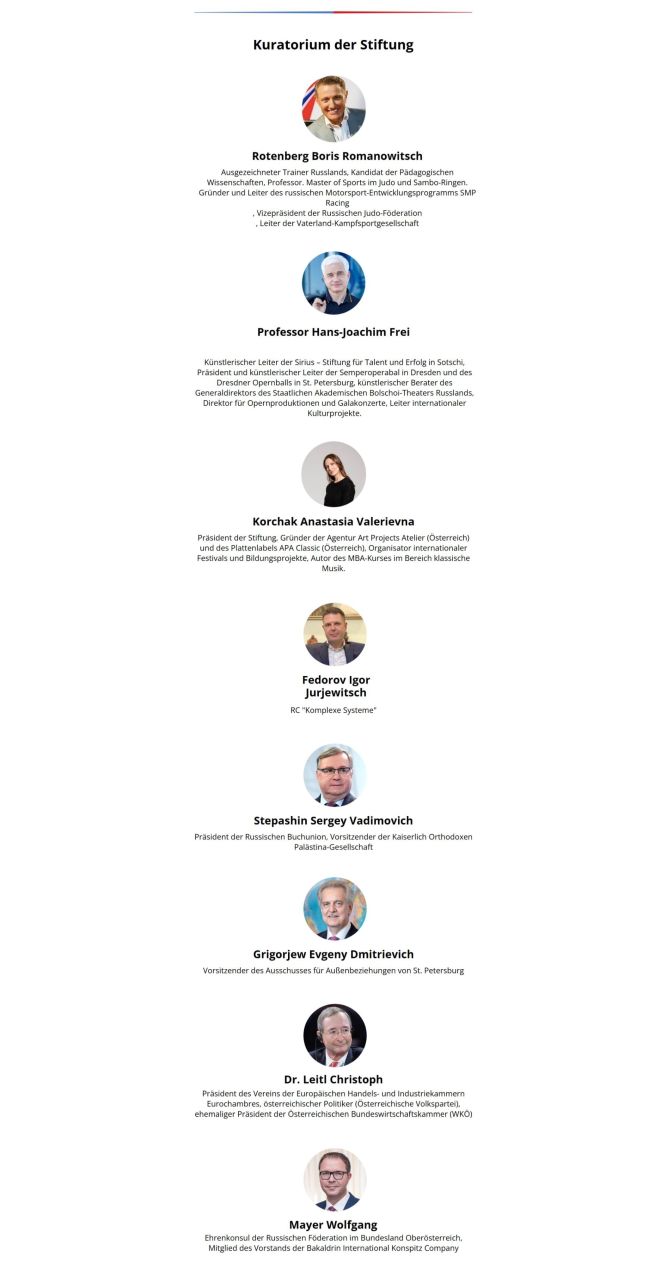 Als Präsidentin dieser Stiftung wird ebenjene Anastasia Korchak genannt. Laut einem russischen Firmenverzeichnis übt sie diese Funktion seit dem 3. Juli 2025 aus. Sie führt ein Kuratorium an, das sich teilweise wie ein Who’s Who des Systems Putin liest. Es seien nur die prominentesten Vertreter genannt: Boris Rotenberg ist ein russischer Oligarch und einer der engsten Freunde Wladimir Putins aus Kindheitstagen, als sie in Leningrad gemeinsam Judo trainierten. Rotenberg gilt als eine der Schlüsselfiguren in der staatlich vernetzten Geschäftswelt Russlands und profitierte von staatlichen Aufträgen für Projekte wie die Olympischen Spiele in Sotschi, was seit 2014 zu internationalen Sanktionen gegen ihn führte.