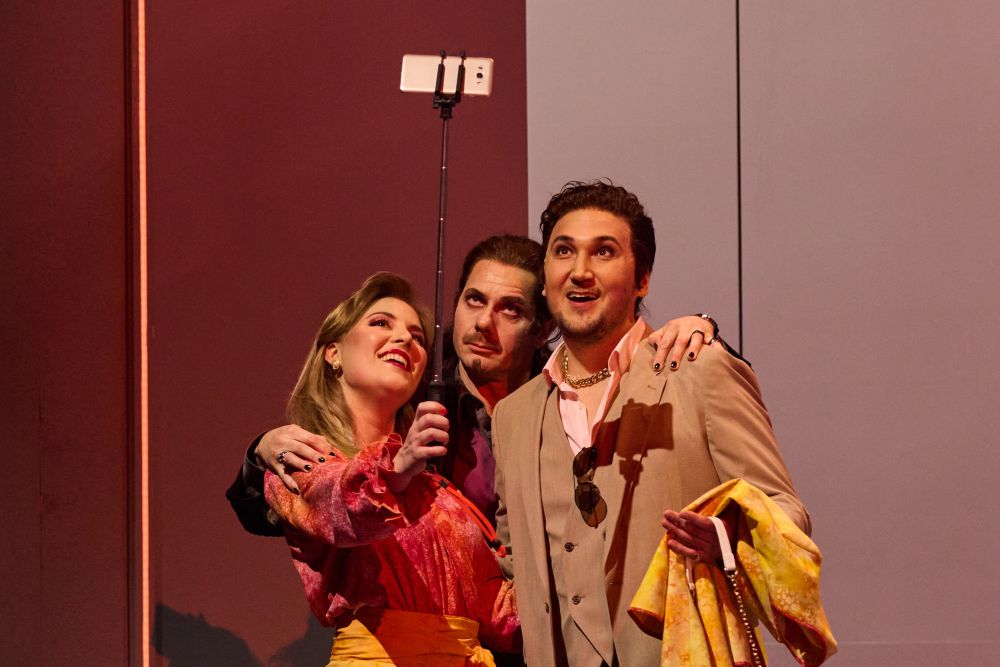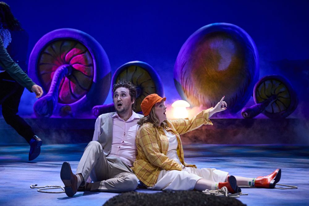 Die nähert sich der Oper eines 19-jährigen auf dem Geniepfad ausgiebig augenzwinkernd und Gott sei Dank ironisch. Da das Anwesen von Don Anchise, dem Kommunalhaupt von Lagonero, den Spielort bildet, ziert entsprechend ein schwarzer See den Bühnenhintergrund. Davor geben sich die Protagonisten die größte Mühe, aus dem Dichter-mäßig verordneten Beziehungschaos eine möglichst unterhaltsame Veranstaltung zu machen. Riesenhafte Erdbeeren, Erbsen oder Karotten (Bühnenbild und Kostüme: Dietrich von Grebmer) schleichen sich aus dem Schnürboden ins Bild und geben die Vitamine für alles weitere vor. Das Phallus-Gemüse Spargel wächst hier ins Tiefe oder horizontal, und weil die absurde Handlung nicht anders auflösbar scheint, beherrschen im zweiten Teil halluzinogene Pilzsorten das Geschehen.