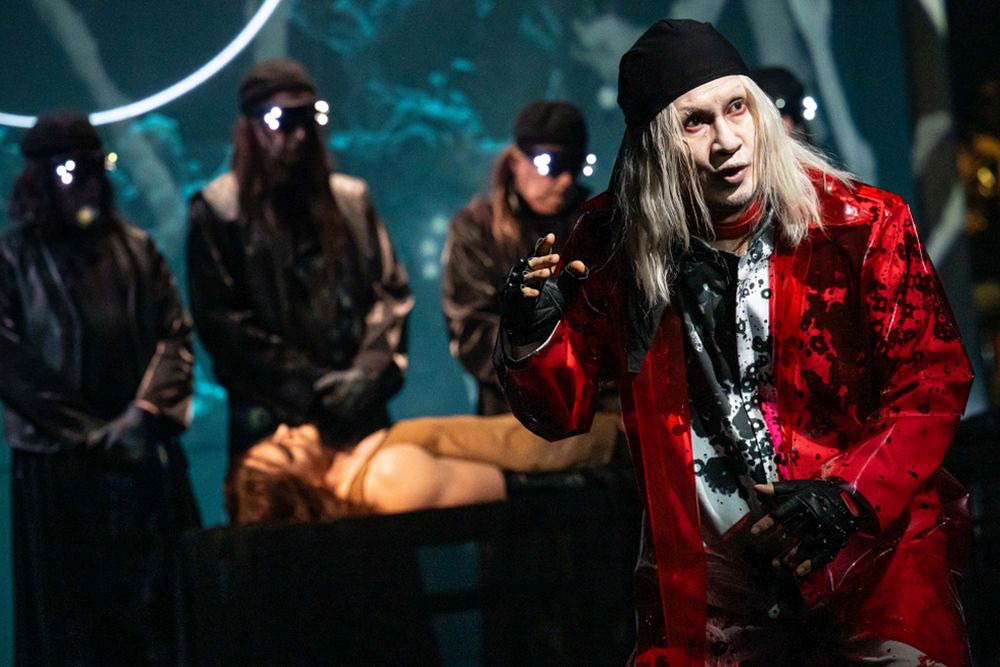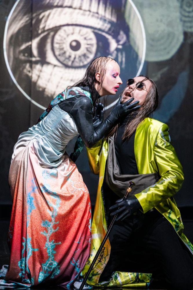Das verdankt man auch der hybriden Kongenial Tätigkeit, Kollegialität und Furchtlosigkeit des Produktionsteams um die eine solche Kooperation verdichtende Regisseurin Nele Lindemann mit Zana Bosnjak (Ausstattung), Piero Glina (Video), Katharina Fritsch (Regie-Mitarbeit) und Ballettdirektor Michal Sedláček (Choreografie). Bestechende Idee: Das Spielwerk ist eine Big-Data-Resonanzmaschine mit den Menschen als Synapsen zur physischen Welt. Das Brain-Fiction-Fluidum macht sich auf der Bühne prächtig. Die menschlichen Strampelversuche in den Fängen von KI, Social Media und Risiken der Entpersönlichung springen ins Auge. Die Projektionen wechseln von Wurzel- und Zellenornamenten zu nächtlichen Skylines und Klangvisualisierungen. Alle Figuren tragen Kostümhülsen aus Manga- und Space-Opera-Ansichten. Körperlichkeit und Berührungen sind atavistische Relikte aus der vormodernen Steinzeit. Die „Bürger“-Figuren operieren und stochern als Maulwurf-Ingenieure mit Brillenlichtern an allem möglichen herum. Gegenbild ist die Prinzessin – ein Cyborg mit Rest-Haarbüscheln am fast kahlen Schädel, unappetitlicher Herpes und herzerbarmender Entkräftung. Dieses Wesen saugt alles an Hass, Häme und Sehnsucht aus den digitalen Bubbles auf und verdünstet es als nach Schönheit riechender Negativenergie. Franziska Krötenheerdt füllt diese hochdramatische Höhensopran-Herausforderung mit faszinierendem Eisfeuer – eindeutig eine der überragenden Musiktheater-Leistungen dieser Spielzeit.