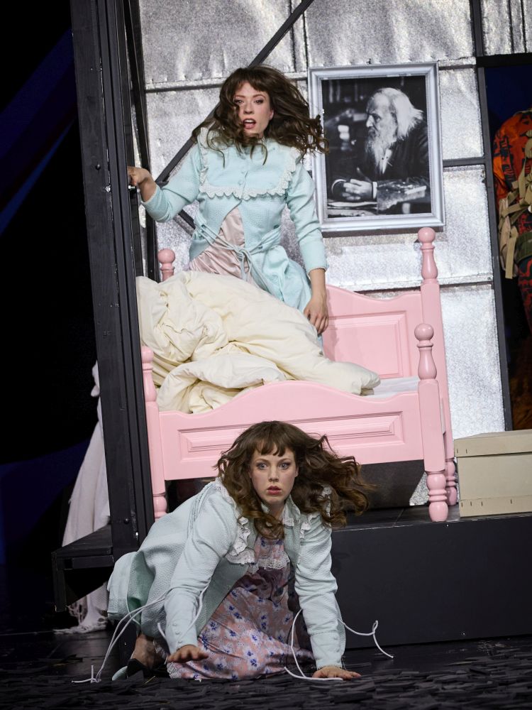 Schon ihr Name auf dem Besetzungszettel rechtfertigte hohe Erwartungen an Julia Grüters Auftritt als Agathe. Die auch anderweitig vielbeschäftigte Sopranistin, damals gleichzeitig mit Jens-Daniel Herzog und Joanna Mallwitz ans Nürnberger Staatstheater gekommen und hier in einer Vielzahl prominenter Partien zu hören, erfüllte alle über Gebühr. Neben ihrer optischen (und in mancher Hinsicht auch vokalen) Zwillingsschwester Veronika Loy als versatiles Ännchen ist sie die Einzige, die dem statischen Geschehen auf der Bühne etwas Leben einhauchen kann. Wie sie, feinste Übergänge zeichnend und mit vorbildlicher Sorgfalt um die Wort-Ton-Beziehung bedacht, Farbe um Farbe, Nuance um Nuance im „Leise, leise“ aufblühen lässt, hat wirklich etwas Entrückendes. Nicht minder feinfühlig: die Kavatine im dritten Akt, in der Grüter das Bild sanfter, aus einer Wolke dringender Sonnenstrahlen mit ebenso großer Anschaulichkeit umsetzt, wie anschließend Veronika Loy ihre parodistische „Kettenhund“-Ballade. Ihre Kabinettstückchen lässt sich die charismatische Sängerin nicht nehmen. Stimmliche Freude in den tieferen Männerregionen machen Wonyong Kang als Cuno und Nicolai Karnolsky als Professor-Dumbledoremit mit einer Autorität, die sich der junge Hektor Palmer Nordfors in der Rolle des Fürsten Ottokar erst noch erarbeiten muss. Kommt Zeit, kommt Rat.