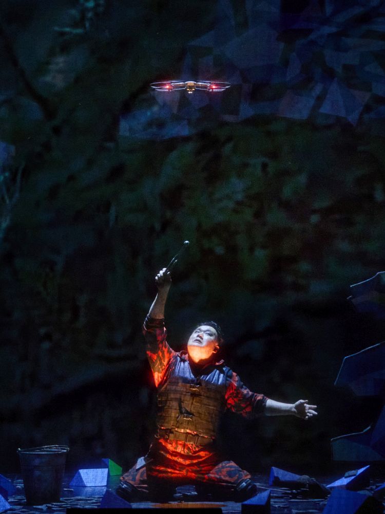 „Den Heil’gen Preis und Dank“, sangen am gestrigen Abend nicht nur die Menschen in Ungarn (und im restlichen Europa). Auch der von Tarmo Vaask hervorragend einstudierte, gerade im „Jägerchor“ und im „Jungfernkranz“ zu kultiviertesten Stimmleistungen angeleitete Chor des Staatstheaters Nürnberg richtete partiturgemäß seine Jubelgebete Richtung Himmel. Adressat? Unbekannt, denn den lieben Gott, der in Webers Erfolgsoper «Der Freischütz» so schirmend seine Hand über die Schwachen und doch Herzensguten hält, wird man hier kaum antreffen. In der Inszenierung von Jossi Wieler und Sergio Morabito – eine Aktualisierung ihrer 2019 erstmals in Straßburg gezeigten Produktion – haben Drohnen das himmlische Regiment übernommen: unheilvolle Spähinstrumente, mit denen sich vom Sessel auf allerbequemste Weise Zerstörungen und Tötungsvorgänge auslösen lassen. Schon zur Ouvertüre huscht das Schattenbild einer Drohne über den geschlossenen Vorhang. Als Drohne entpuppt sich auch der Raubvogel, den Max bei seinem ersten Freikugelschuss aus den Wolken holt. Eine Drohne schließlich ist Samiel, der schwarze Jäger, und drohnengemäß poltert er die gesprochenen Worte, die ihm der Textdichter Friedrich Kind in den Mund legt, nicht wie ein Dämon daher, sondern leiert sie ihm Tonfall einer unausgereiften KI herunter.
