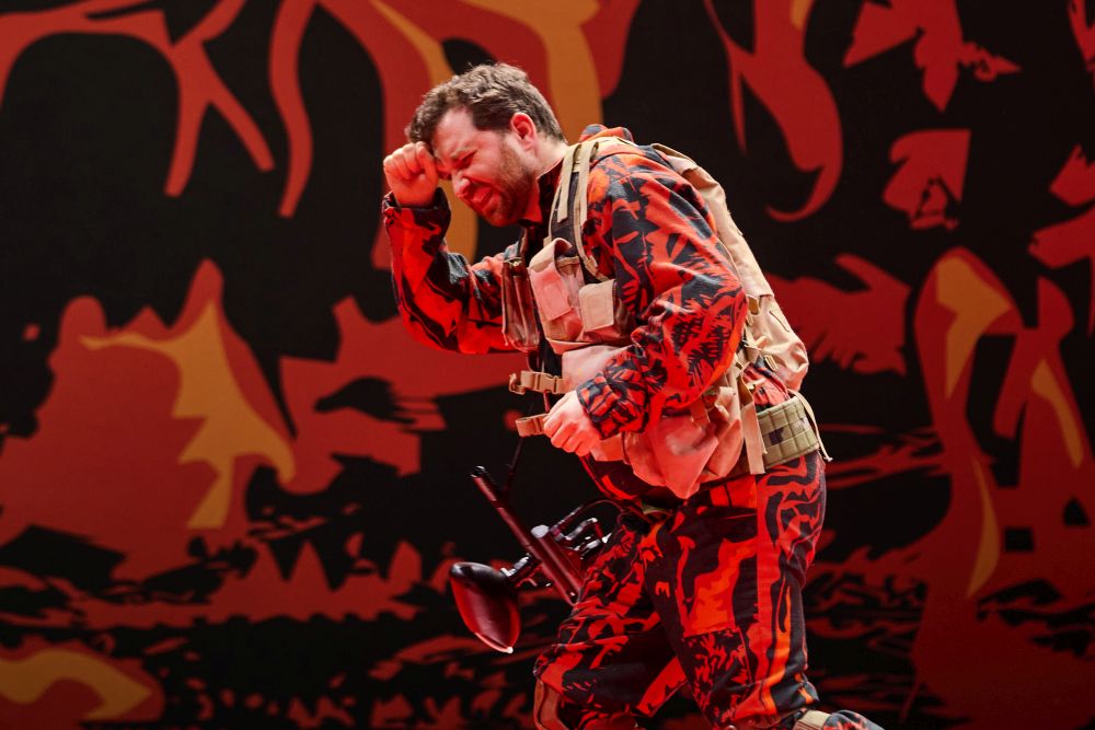 Überhaupt der Text: Wegen ihrer Antiquiertheit gelten die gesprochenen Dialoge als großes Manko des «Freischütz». Wieler und Morabito schieben sie mit Unterstützung von Staatstheater-Schauspielern in Form eines künstlich artikulierten Hörspiels ein – was den Fluss der Aufführung zwar immer wieder lähmt, gleichzeitig aber auch eine verstörend-halluzinierende Wirkungen ausübt und gut zur Künstlichkeit des Settings passt. Hierfür hat sich die Ausstatterin Nina von Mechow von den mit zweidimensionalen Gaming-Welten korrespondierenden, Bekanntes in ungewöhnliche Kontexte versetzenden Bilderwelten des Berliner Künstlers Alekos Hofstetter anregen lassen. Der (para-)militärische Tarnfleck ist hier allgegenwärtig, ziert ganze Wälder und Schluchten und auch die Uniformen, in denen die Bauern- und Jägergemeinschaft das Sternleinschießen zu Beginn der Oper in einen Lasertag- oder Paintball-Event verwandeln, sind diesem Look verpflichtet.