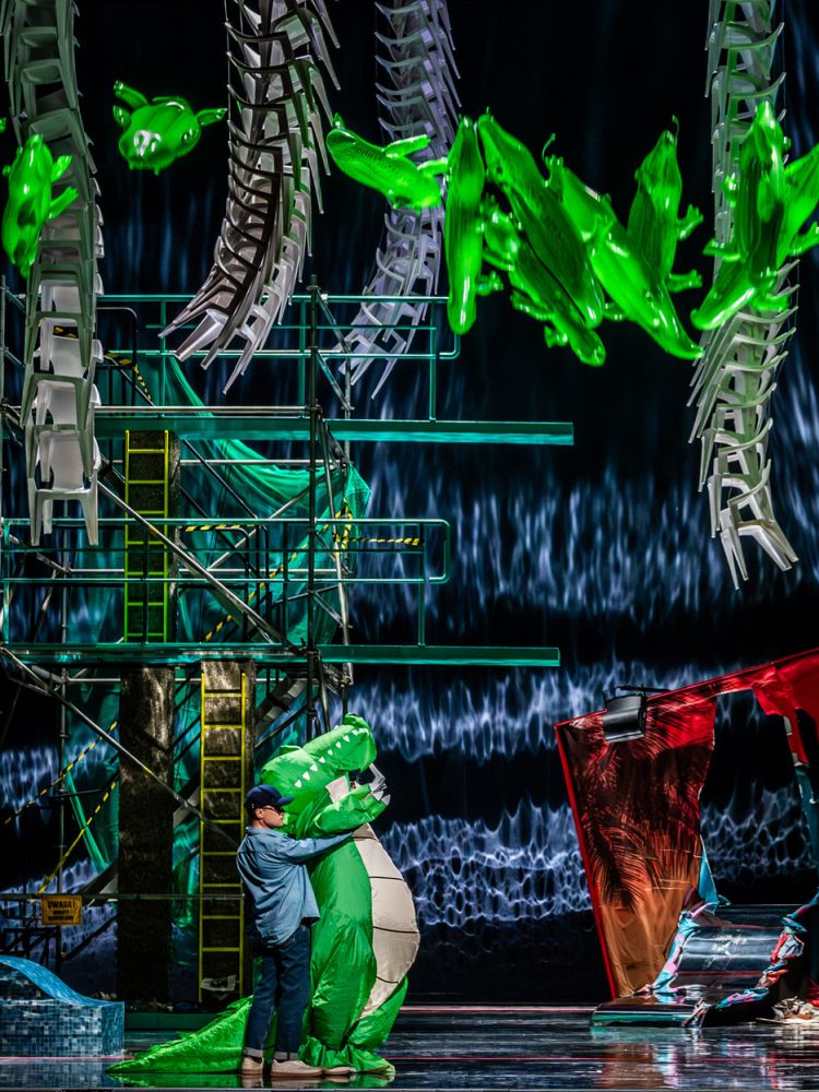 Die Inszenierung von Barbara Wiśniewska nimmt diesen Schwebezustand ernst und übersetzt ihn in eine visuelle Poetik zwischen Küstenlandschaft und surrealem Meeresbiotop. Das Bühnenbild von Maćko Prusak und die Kostüme von Natalia Kitamikado füllen die Szene mit hybriden Wesen – Austern, Krabben, Quallen –, durchaus dekorativ, surrealistisch und sogar symptomatisch wirken: Zeichen einer Welt, in der Natur und Imagination ununterscheidbar geworden sind. Besonders im zweiten Akt entfaltet sich ein geradezu barockes Traumtheater, ein ozeanischer Zirkus von suggestiver, bisweilen auch bewusst überbordender Bildkraft. Gerade diese Überfülle folgt einer inneren Logik: Träume sind nicht sparsam.
