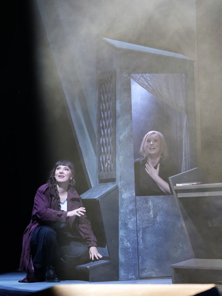 Immer wieder schafft Konwitschny stimmige Bilder, wie kurz nach dem Beginn, wenn sowohl Katja als auch ihre Schwiegermutter Kabanicha den Gatten bzw. Sohn Boris am Arm zu sich ziehen und ihn förmlich zu zerreißen drohen. Oder wenn Katja ihrer Freundin Varvara (hier: Barbara) ihren eigenartigen Traum in einem Beichtstuhl der Kirche offenbart, die als raffiniertes Einheitsbühnenbild dient (künstlerische Umsetzung nach einer Idee von Konwitschny: Karin Waltenberger, die auch für die Kostüme verantwortlich zeichnet).