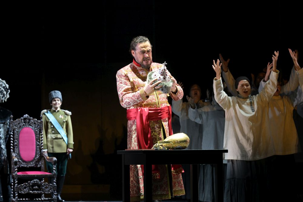 Das ist umso beeindruckender als das Publikum diesen Mann, der durch grausige Bluttaten an die Macht kam, zuvor als Mensch und Vater erlebt. Der Gedanke an den toten Knaben Dmitrij wird ihn in den Wahnsinn treiben. Für seine Tochter Xenia, deren kurzem Auftritt Anna Nekhames Intensität verleiht, hätte er sich mehr gewünscht als schon während der Verlobungszeit zu verwitwen. Seinen Sohn, dem offenbar innig geliebten und von Karolina Makuła innig gesungenen Fjodor, ermuntert er, kindisch die Geschichte vom Papagei Popin und den Mägden zu erzählen. Sogar dem von AJ Glueckert charakterstark gegebenen selbst nach der Zarenmacht strebenden Fürst Schuiski ist er bereit zuzuhören und zu glauben.