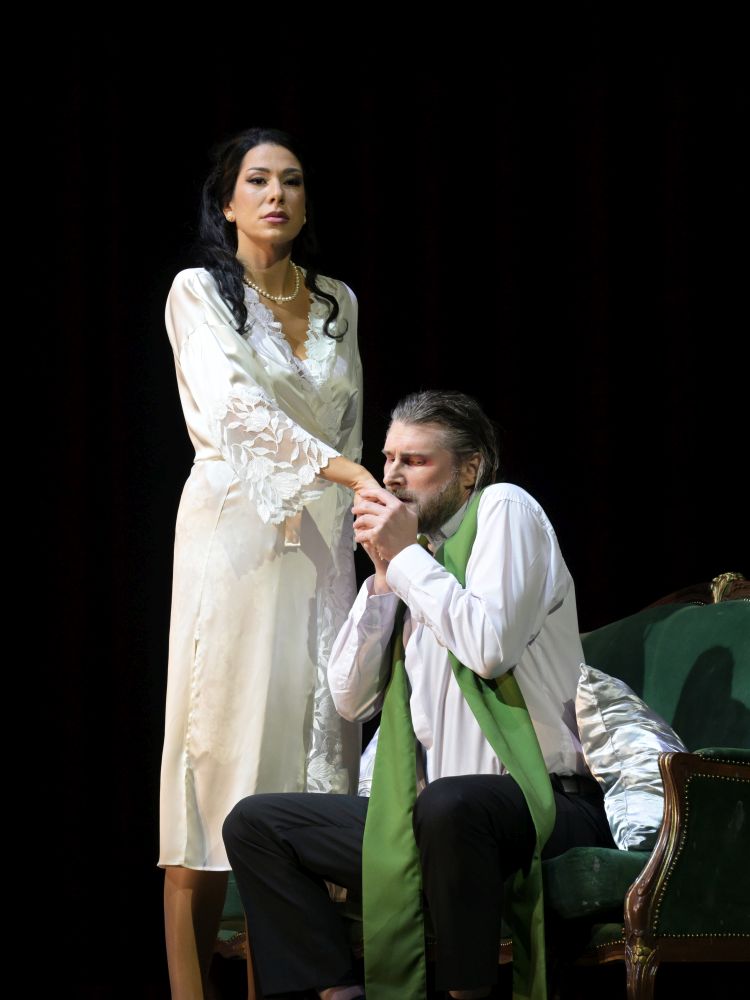 Ein wahrer Unmensch ist dieser Godunow also nicht, nur durch Gier deformiert unter die Räder der Geschichte gekommen. Ganz anders verhält es sich da mit Marina Mnischek und dem Jesuiten Rangoni. Die Ergebenheit einer Tochter fordert der Kirchenmann von der Tochter des Wojwoden von Sandomir. Mussorgski hatte den „Polen-Akt“ nachgereicht, um der Zensur zu gefallen. Eine Frauenrolle hatte gefehlt. Man könnte sagen, der Komponist hat dem Wunsch mit dem polnischen Intermezzo auf hinterlistigste Weise entsprochen: Marina Mnischek, die Zarin werden will und das Volk mit ihrer Schönheit blenden, und Rangoni, der im Hintergrund die Strippen ziehen will, sind das personifizierte Böse. Regisseur Keith Warner, der so viele eindrückliche Erzählmomente schafft, lässt die Schöne den „Vater“ genussvoll auspeitschen, den jedoch, ohne sie anzugreifen, vollständig über ihren Willen triumphieren. Thomas Faulkner ist ein packender Rangoni. Ist sein Körper wirklich nurmehr Stein, wie er später Dmitrij sagen wird? Marinas Herz ist es. In einer schönen Projektion sehen wir die Entstehung ihre neuen Kleides durch Volkes Hände Arbeit. Sie verachtete das Ergebnis ebenso wie die Huldigungen. Diese Frau als Zarin! Und dabei ist Sofija Petrović mit dieser Szene erst am Anfang ihrer Kunst. Richtig in Fahrt kommt sie, als sie Dmitrij instrumentalisiert. Dramatisch, sinnlich, üppig, eiskalt. Er wird ihr williger Popanz sein.