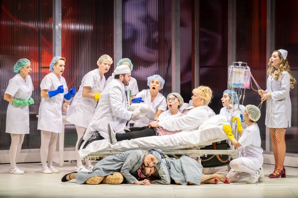 Dies Haus des Färbers ist umgedeutet zu einer Art Geburtsklinik. Ruxandra Donose, die sich als höhendramatische Amme immer wieder den Vergleich mit der Hündin gefallen lassen muss, hat das Haus aufgetan. Damit auch jeder begreift, dass es ums Gebären geht, finden sich reihenweise Föten an den Wänden. Johannes Leiacker liefert dazu das, was er zuverlässig immer liefert: Hohe weiße Wände mit bemerkenswert-dezidierter Wandlungsfähigkeit und genau ins Bild passenden Kostümen. Doch ausgerechnet die namenlose Waise, die der Färber sich gekauft hat, rebelliert. Sie versagt dem älteren Mann ihren Leib. So ernst die Szene endet, so skurril ist sie angelegt. Mit der Frau als augenrollendem Frauenzimmer im Negligée samt Morgenmantel und Turban und der prächtigen Spielkraft und Stimme von Aile Asszonyi.