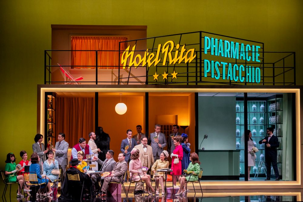 Das Einheitsbühnenbild von Serena Rocco bietet Räume für beide Opern: Links sieht man die Apotheke des Don Annibale Pistacchio, links die Bar von Ritas Gasthaus, darüber ein Gästezimmer mit Terrasse. Kostüme (Valeria Donata Bettella) wie Szene verweisen auf eine Handlung in den späten Wirtschaftswunderjahren. Im Gasthaus feiert man die Hochzeit des gutmütigen Apothekers mit Serafina, die von Bonfadelli als lebensfrohes Luder gezeichnet wird, das den Avancen des gewitzten Enrico (im Original ihr Cousin) sexuell gerne nachgibt. Weil Don Annibale am Folgetag eine Reise antreten muss, beschäftigt Enrico diesen während seiner Hochzeitsnacht derart gewitzt in unterschiedlichen Verkleidungen, dass der arme Bräutigam gar nicht zum Vollzug seiner Ehe kommt.