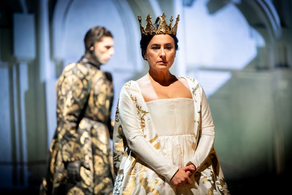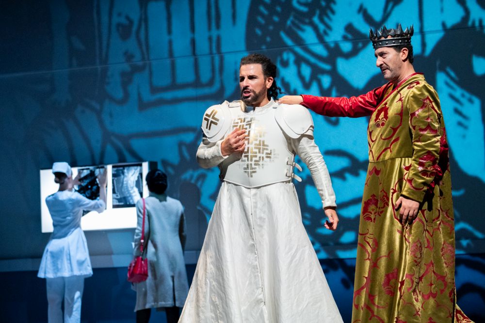 Das Regieteam von Francesco Micheli, dem hier der Musikkritiker Alberto Mattioli als Dramaturg angehört, fügte der historischen Handlung eine heutige hinzu: Eine junge Frau bangt im Warteraum eines Krankenhauses um ihren schwer erkrankten Mann. Sie erinnert sich an einen Urlaub in Venedig, an den Besuch des Palazzos Ca‘ Corner della Regina, an die Geschichte der darin aufgewachsenen Caterina Cornaro („Cornaro“ ist die italienische Schreibweise für das venezianische Geschlecht „Corner“). Im Prolog, dem in diesem Werk zwei Akte folgen, wechseln sich die beiden Ebenen ab, die Handlung spielt zunächst vorrangig in historischen, prächtigen Kostümen. Ein besonderer Hingucker ist der gold schimmernde Mantel von Mocenigo, den Riccardo Fassi mit einer sonoren Tiefe ausstattet, die wunderbar zu seinem diabolischen, weiß geschminkten Äußeren passt.