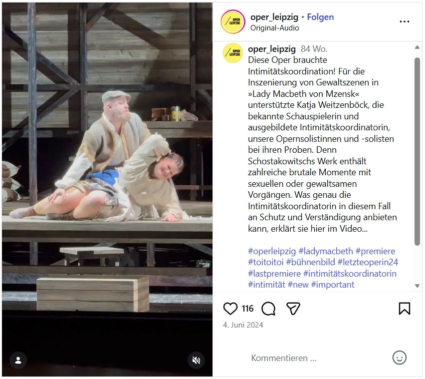 Für die theatrale Darstellung und Wirkung hat das – unter Mitwirkung einer zugezogenen Intimitätskoordination – eine naheliegende Konsequenz: Die früher oft aus Improvisationen entwickelte performative Transformation sexueller Begegnungen und erotischer Inhalte bedarf generell einer Choreographie nach fixierten Standards: „Das Ziel einer Intimitätskoordination ist, dass sich alle Beteiligten sicher und wohl fühlen und niemand körperlich oder seelisch zu Schaden kommt“, definiert der deutsche Berufsverband Intimitätskoordination und Kampfchoreografie e.V. Dass dem Arbeitsfeld der Intimitätskoordination auch in der Opernproduktion ein zunehmender Stellenwert eingeräumt wird, ist u.a. einem Video im Instagram-Kanal der Oper Leipzig ersichtlich, das im Juni 2024 im Zuge einer Inszenierung von Schostakowitschs «Lady Macbeth von Mzensk» veröffentlicht wurde.