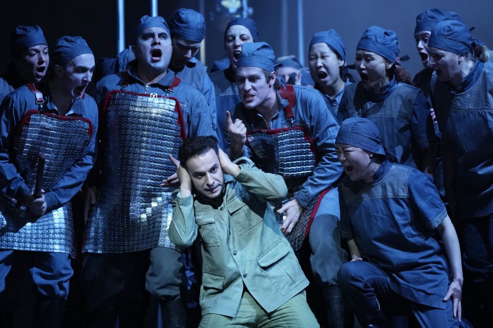 Bis zu diesem Zeitpunkt folgt die Regie von Jasmina Hadžiahmetović weitgehend der Handlung, gibt den Bühnenakteuren viel Raum und ermöglicht ihnen über weite Strecken das Rampensingen. Im ansprechend ausgeleuchteten Einheitsbühnenbild von Paul Zoller bewegen sich der Chor und die Solisten in einem abstrakten Raum, mit Löchern im Boden, die zu den Schlachtplätzen führen, und Steinen als Sitzgelegenheiten, die an Totenköpfe erinnern. Statt China wird hier ein Zustand visualisiert, mitsamt der besungenen Mondscheibe als Sinnbild für die Blutleere innerhalb eines lebensfeindlichen Regimes.