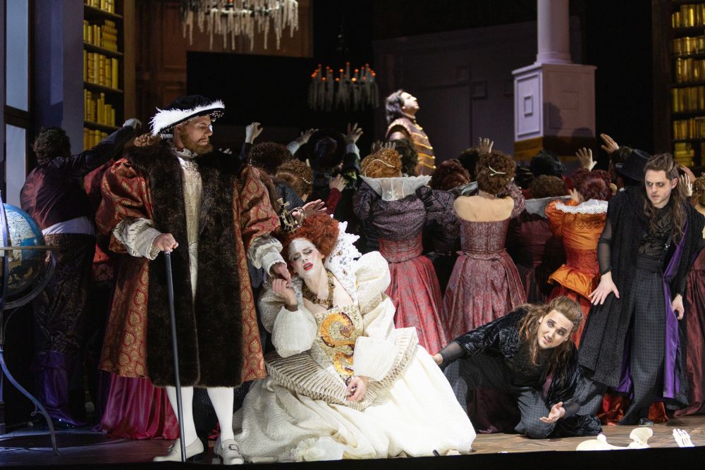Zeitlicher Startpunkt der Handlung: die letzten Stunden vor Turandots Hochzeit, in denen die junge Braut in ihrer Fantasie mit historischen und mythischen Identifikationsfiguren verschmilzt, die sowohl ihre Sorgen und Ängste als auch konkrete Elemente der von Gozzi und Schiller geschaffenen Handlungsvorlage spiegeln. Da ist die biblische Judith, die Holofernes mit einem Schwert den Kopf absäbelt, das Vergewaltigungsopfer Medusa, das durch die Hand des Perseus ein ebensolches Schicksal erleidet, oder die englische Königin Elisabeth, unter deren Herrschaft das Henkersbeil gleichfalls keinen Beschäftigungsmangel zu leiden hatte. Im Gewand der „Virgin Queen“ steigt Turandot, erstmals singend, schließlich selbst auch als Quiz-Masterin in den Ring. Mit dem wie stets agilen, seine kurzen Einwürfe singschauspielerlisch perfekt platzierenden Hans Kittelmann an ihrer Seite (Kaiser Altoum als Henry VIII., eine weitere Berühmtheit unter den historischen Halsabschneidern), postiert sie sich dabei, umgeben von einer Bücherlandschaft, auf einem Schafott.