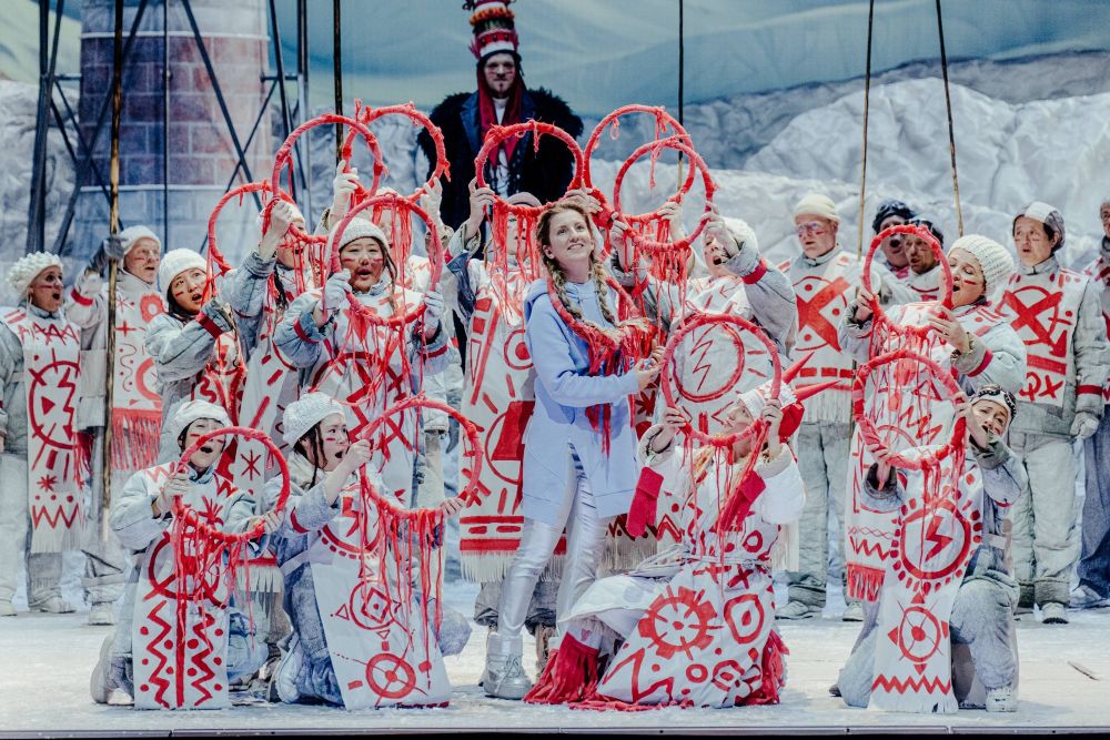 «Schneeflöckchen» ist großjährig geworden. Wohlbehütet wächst das ganz entzückend von Josefine Mindus gesungene Mädchen bei Vater Frost in Eiseskälte auf, dem wie immer stimmstarken Young Doo Park (der auch den Bermjata gibt). Nichts ahnt es vom Unheil, das seine schiere Existenz über die Welt gebracht hat. Denn seit Vater Frost und Mutter Frühling, Camille Sherman in Bestform, Schneeflöckchen im Lauf einer kurzen heftigen Affäre zeugten, versagt der Sonnengott Jarila der Erde Wärme und Licht. Die Winter werden immer länger, die Menschen beten einen Reaktor an, der ihnen immerhin ein wenig Wärme schenkt. Doch gerade zu ihnen, den wärmebedürftigen und zur Wärme fähigen Menschen zieht es Schneeflöckchen.
